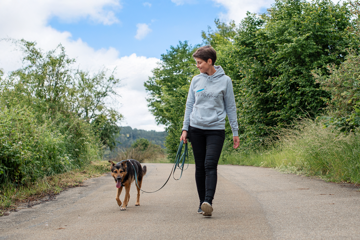 Sonja, ursprünglich aus der Region Stuttgart, arbeitete damals noch als chemisch-technische Assistentin im Labor. Eigentlich wollte sie sich nur informieren, wie sie Tara helfen könnte – doch die Faszination für Hundeverhalten ließ sie nicht mehr los. Sie begann eine zweijährige Ausbildung zur Hundetrainerin bei der ATN (Akademie für angewandte Tierpsychologie und Tierverhaltenstraining) und machte aus ihrer neuen Leidenschaft schließlich ihren Beruf. Heute ist »Muthund« mehr als nur eine Hundeschule. Es ist ein Ort – oder besser gesagt: ein mobiles Konzept – für beziehungsorientiertes, positives Training. Sonja Dänzer arbeitet bedürfnisorientiert, das heißt dass nicht nur das Verhalten des Hundes zählt, sondern auch die Emotionen und Bedürfnisse von Mensch und Tier. »Hinter jedem Verhalten steckt ein Bedürfnis – und das gilt es zu erkennen«, erklärt sie uns lächelnd.