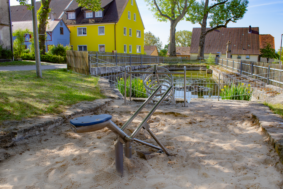 Der Spielplatz in Preuntsfelden hebt sich durch seine idyllische Lage am Dorfweiher ab. Während das Multifunktionsgerät mit Rutsche und Schaukeln die Klassiker abdeckt, bieten ein Sandbagger und eine archimedische Schraube außergewöhnliche Spielmöglichkeiten, bei denen Kinder Sand- und Wasserspiele kombinieren können. So entsteht eine gelungene Mischung aus Vertrautem und Besonderem.